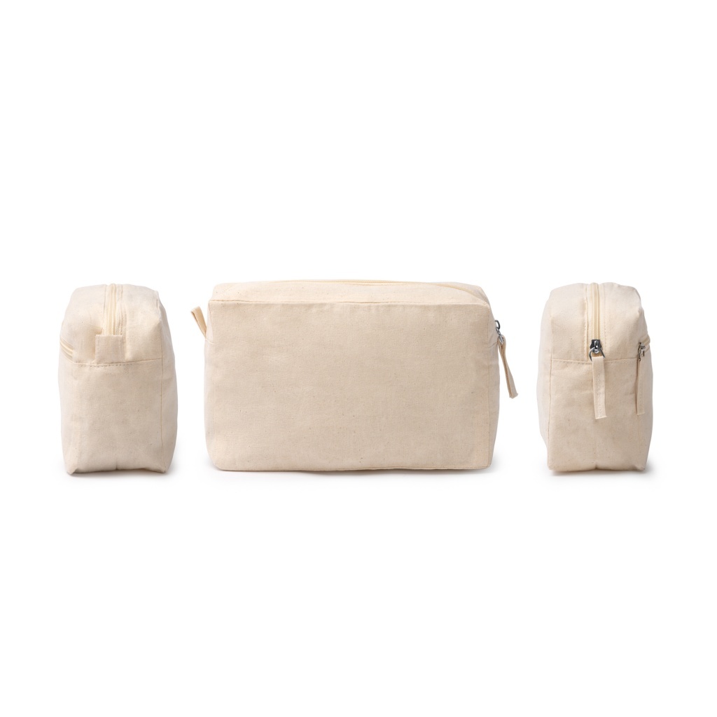 Practical cosmetic bag made of 100% cotton 150 gsm with zipper closure. Designed with a double pocket layout featuring a main pocket and a side pocket for organized storage.