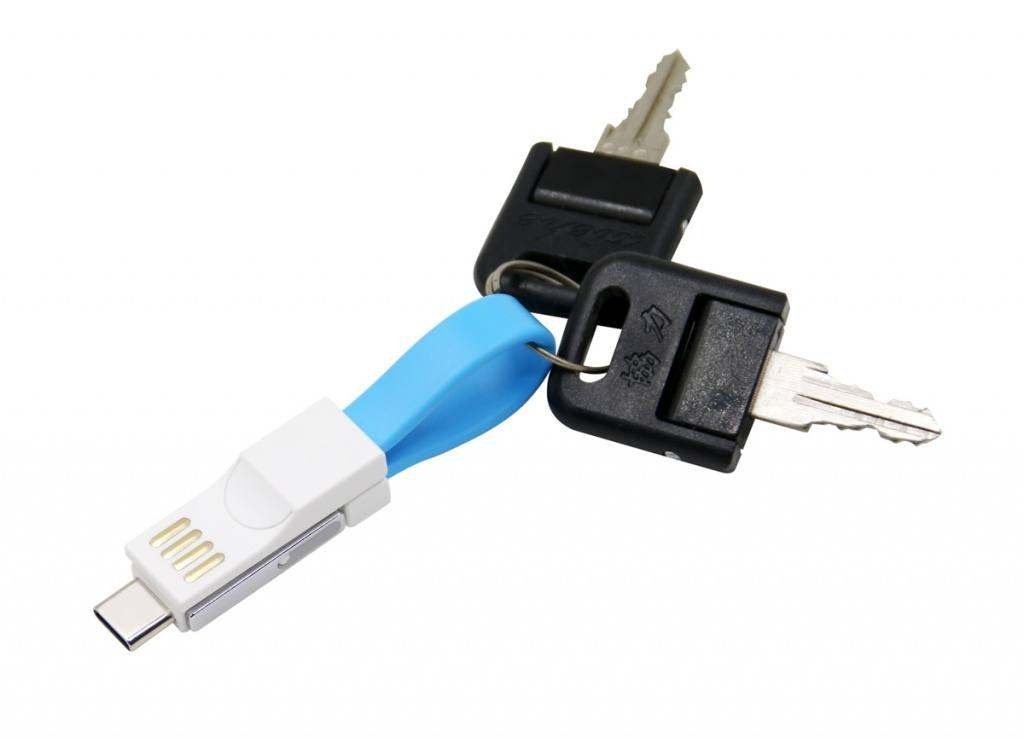 Keychain and 3-in-1 USB charging cable with magnetic closure. Attach your keys to the keychain and charge devices using micro USB, Lightning, or USB Type-C connectors. Small size, great functionality.