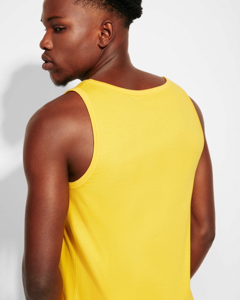 Vest with wide straps and a slim fit, featuring ribbed single jersey at the neck and armholes. Looped side seams with four-thread construction enhance durability. Texas is a semi-fitted tank top made from 100% cotton — a summer wardrobe basic.ieży.