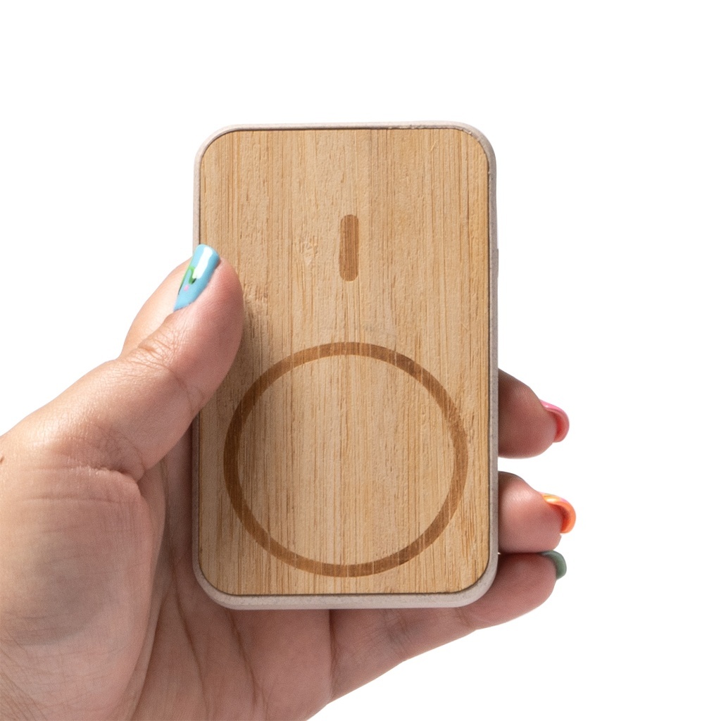 Powerbank o pojemności 5000 mAh z obudową wykonaną z bambusa i włókna pszennego oraz wbudowaną ładowarką bezprzewodową z funkcją mocowania magnetycznego to kompaktowe i ekologiczne rozwiązanie do ładowania urządzeń w podróży. Pojemność 5000 mAh zapewnia pewne doładowanie smartfona lub innych urządzeń.