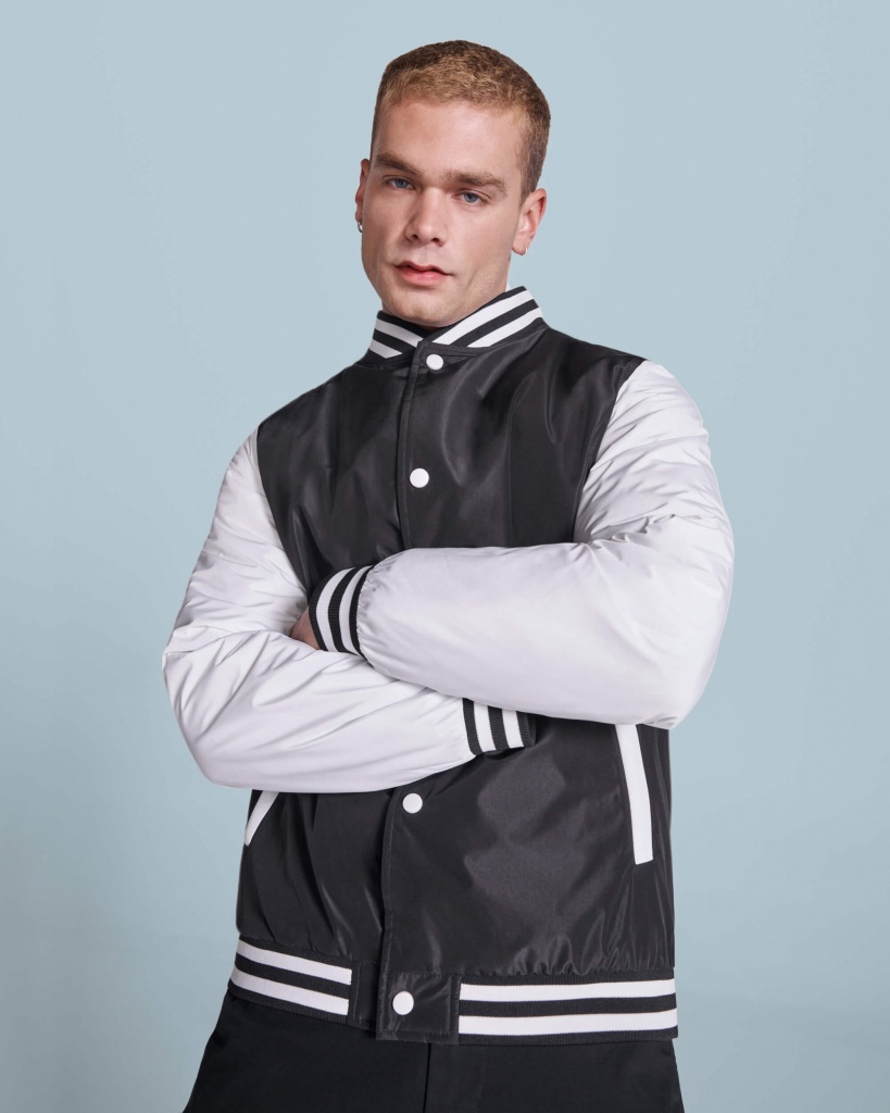 • CALIFORNIA - Dwukolorowa kurtka unisex z pikowanym wnętrzem, kieszeniami na suwak i guzikami na zatrzask.