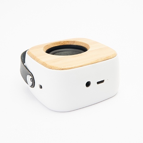 Bezprzewodowy głośnik Bluetooth o eleganckim wykończeniu. Obudowa z ABS z frontem z naturalnego bambusa. W zestawie uchwyt z imitacji skóry. Moc wyjściowa: 3 W. Bateria wielokrotnego ładowania oraz dołączony kabel do ładowania. Opakowanie jednostkowe w pudełko eco design.