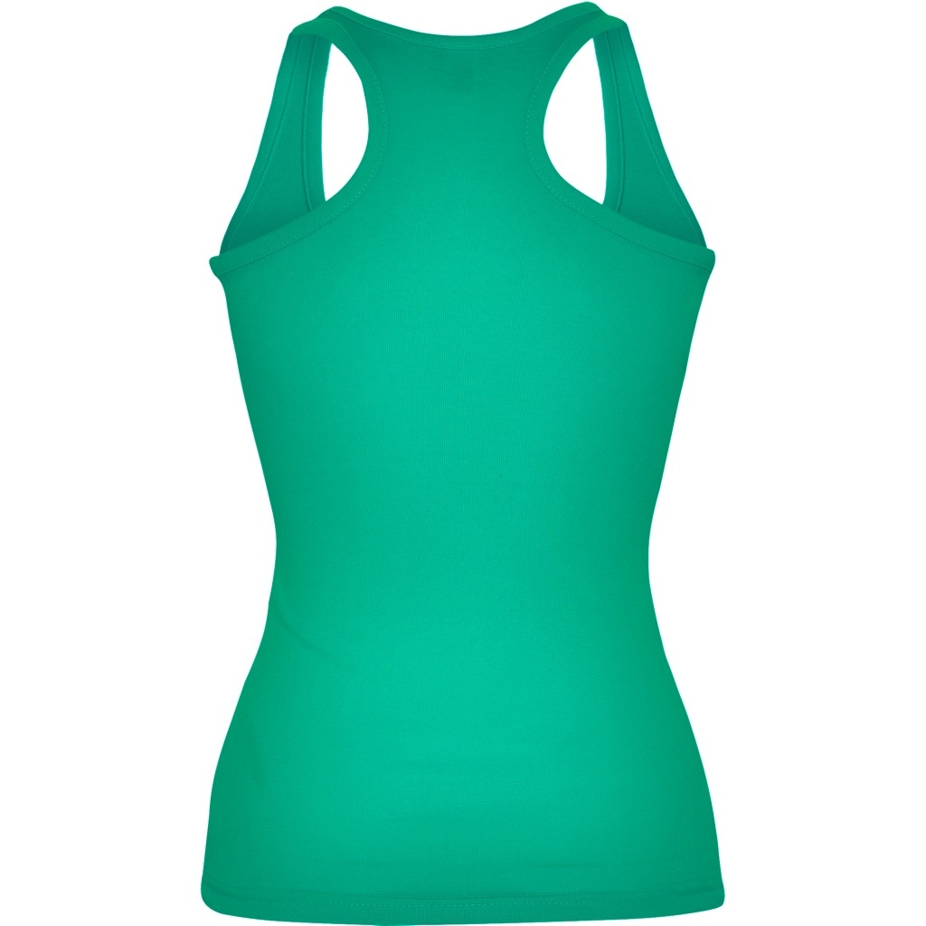 Dopasowany damski top. Dekolt i ramiona wykończone lamówką. Tył w stylu pływackim. Szwy boczne.