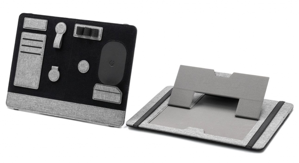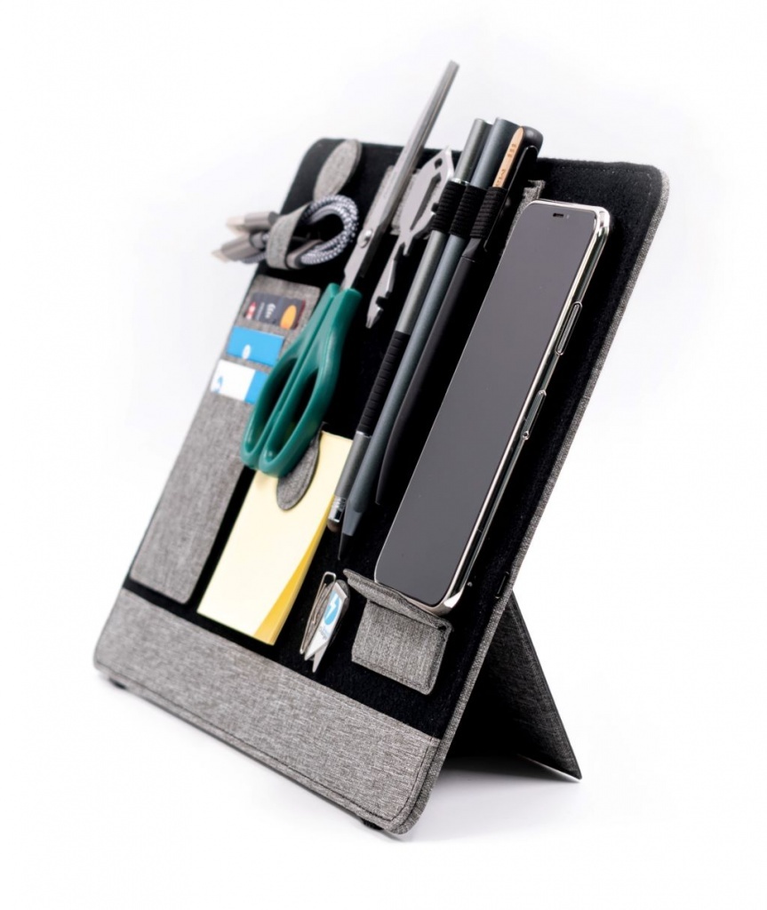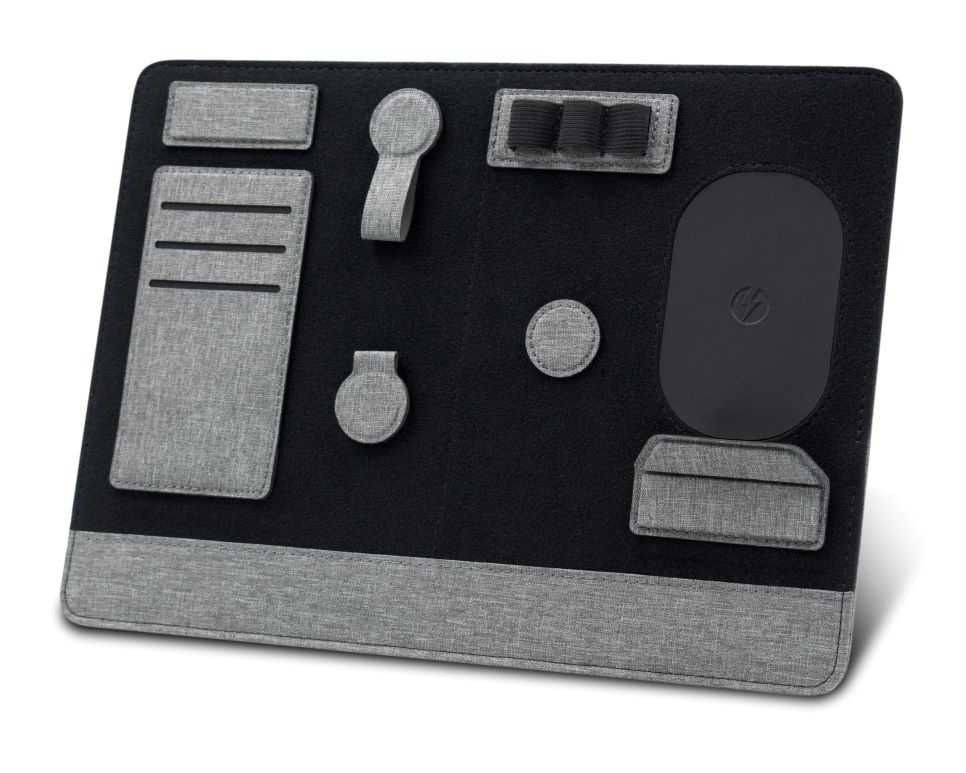 Wykonany z przetworzonych ♻ butelek PET, Clipboard Pro Eco pełni jednocześnie funkcję organizera mocowanego do laptopa oraz stojaka/organizatora na biurko — idealny dla współczesnych nomadów. Organizer zawiera regulowany stojak na telefon z szybkim ładowaniem bezprzewodowym 15 W, schowek, dwie magnetyczne stacje dokujące, uchwyt na długopis, uchwyt na karty, klips do kabla oraz podstawkę na telefon. Organizacja przestrzeni na biurku jeszcze nigdy nie była tak prosta! Produkt mocuje się do laptopa podobnie jak elastyczna zakładka. Clipboard Pro posiada także zintegrowaną, składana podstawkę pod laptopa, tworząc ergonomiczną przestrzeń pracy w dowolnym miejscu.