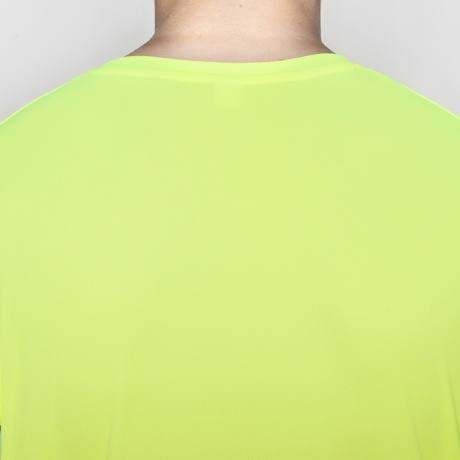 Techniczna koszulka z krótkim rękawem zapewniająca wysoką widoczność. Okrągły dekolt wykonany z tej samej tkaniny z wzmocnionymi szwami. Dwie poziome taśmy odblaskowe na środku oraz pojedyncze taśmy na rękawkach.