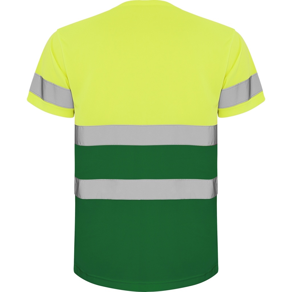 Techniczna koszulka z krótkim rękawem zapewniająca wysoką widoczność. Okrągły dekolt wykonany z tej samej tkaniny z wzmocnionymi szwami. Dwie poziome taśmy odblaskowe na środku oraz pojedyncze taśmy na rękawkach.