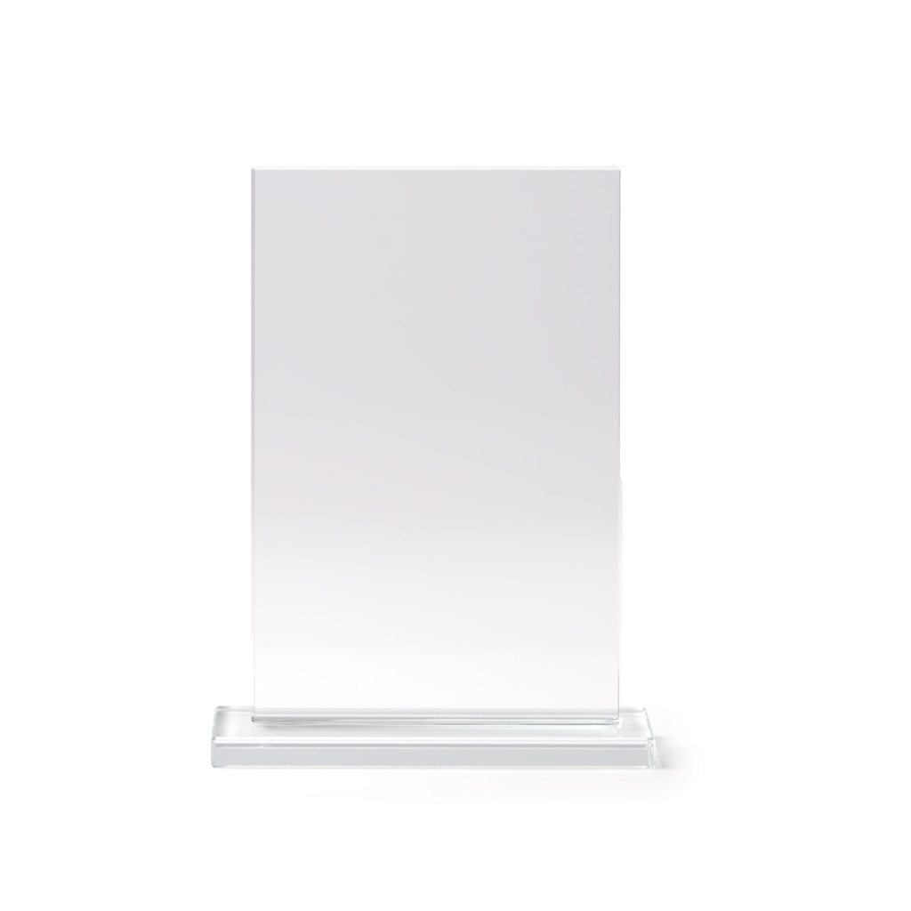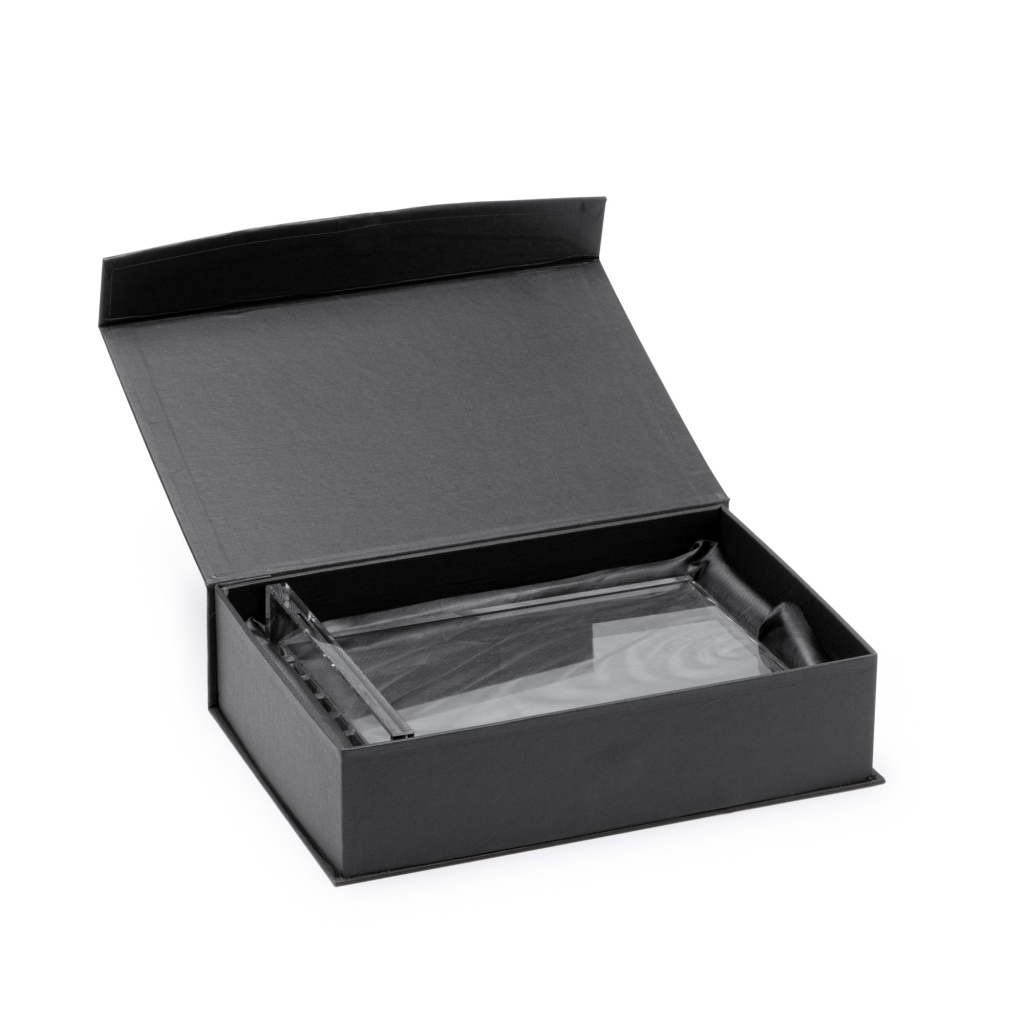 Szklane trofeum o prostokątnym kształcie i prostokątnej podstawie. W zestawie czarne etui.