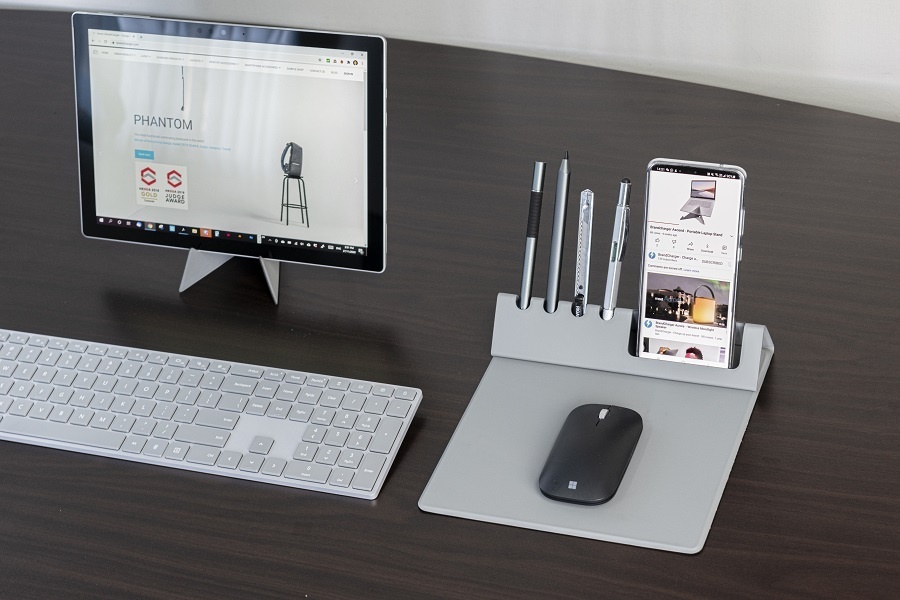 Odśwież swoje stanowisko z Evopad — uniwersalnym, przenośnym akcesorium biurkowym, które łączy podkładkę pod mysz, stojak na telefon oraz miejsce na długopisy.