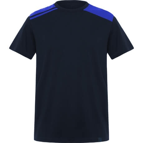 Kolorowa koszulka z krótkim rękawem, z okrągłym dekoltem wykończonym kontrastową wewnętrzną obwódką. Kontrastowe wstawki na ramionach oraz dopracowane detale.