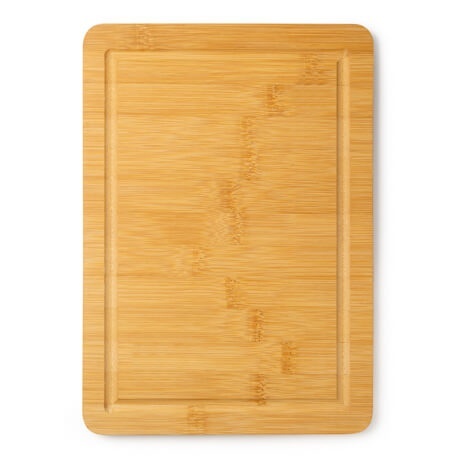 Prostokątna deska do krojenia wykonana z naturalnego bambusa, wyposażona w obręcz do odprowadzania soków.