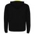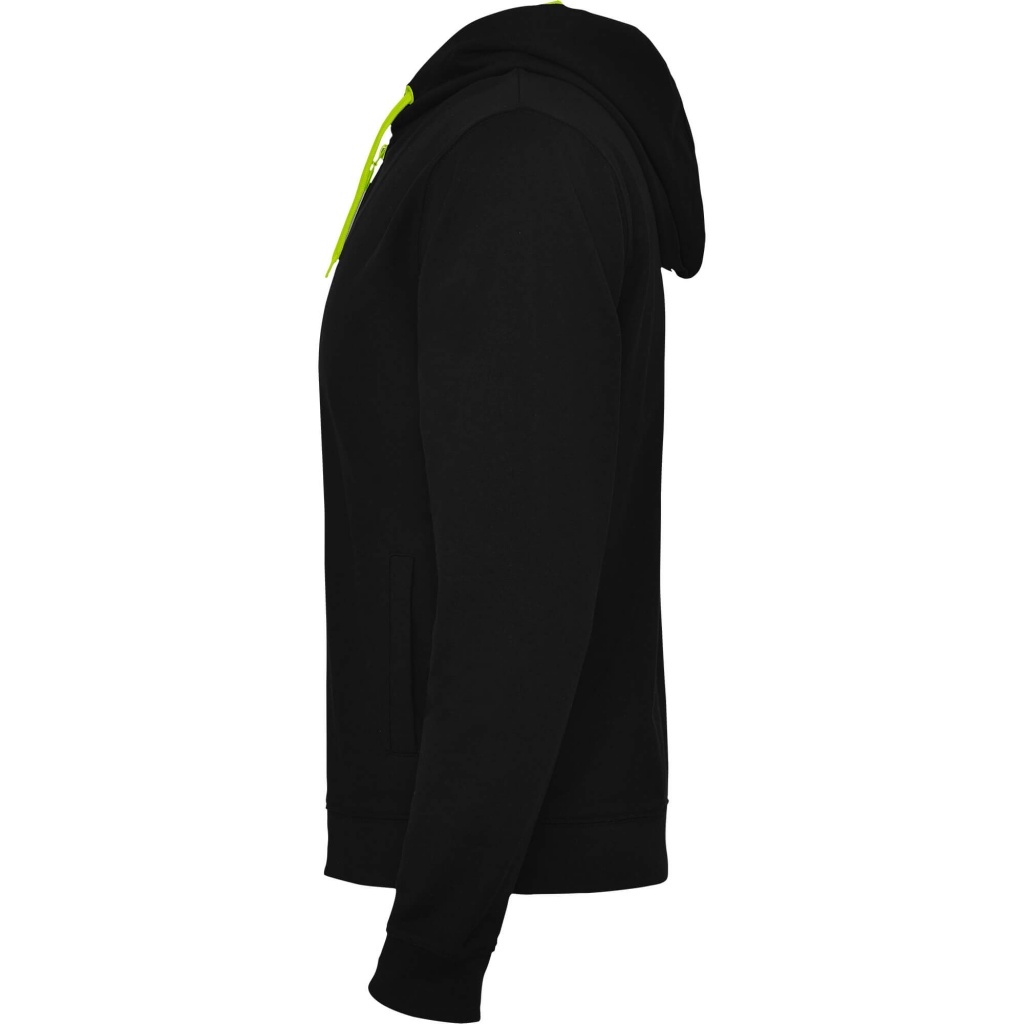 Rozpinana bluza z fluorescencyjnymi akcentami. Kaptur ma podszewkę z mikro perforowanej tkaniny poliestrowej w kontrastującym fluorescencyjnym kolorze. Sznurek i metalowe oczka również w fluorescencyjnym kolorze. Prążkowane mankiety i dół bluzy 1x1.