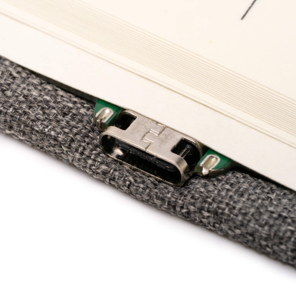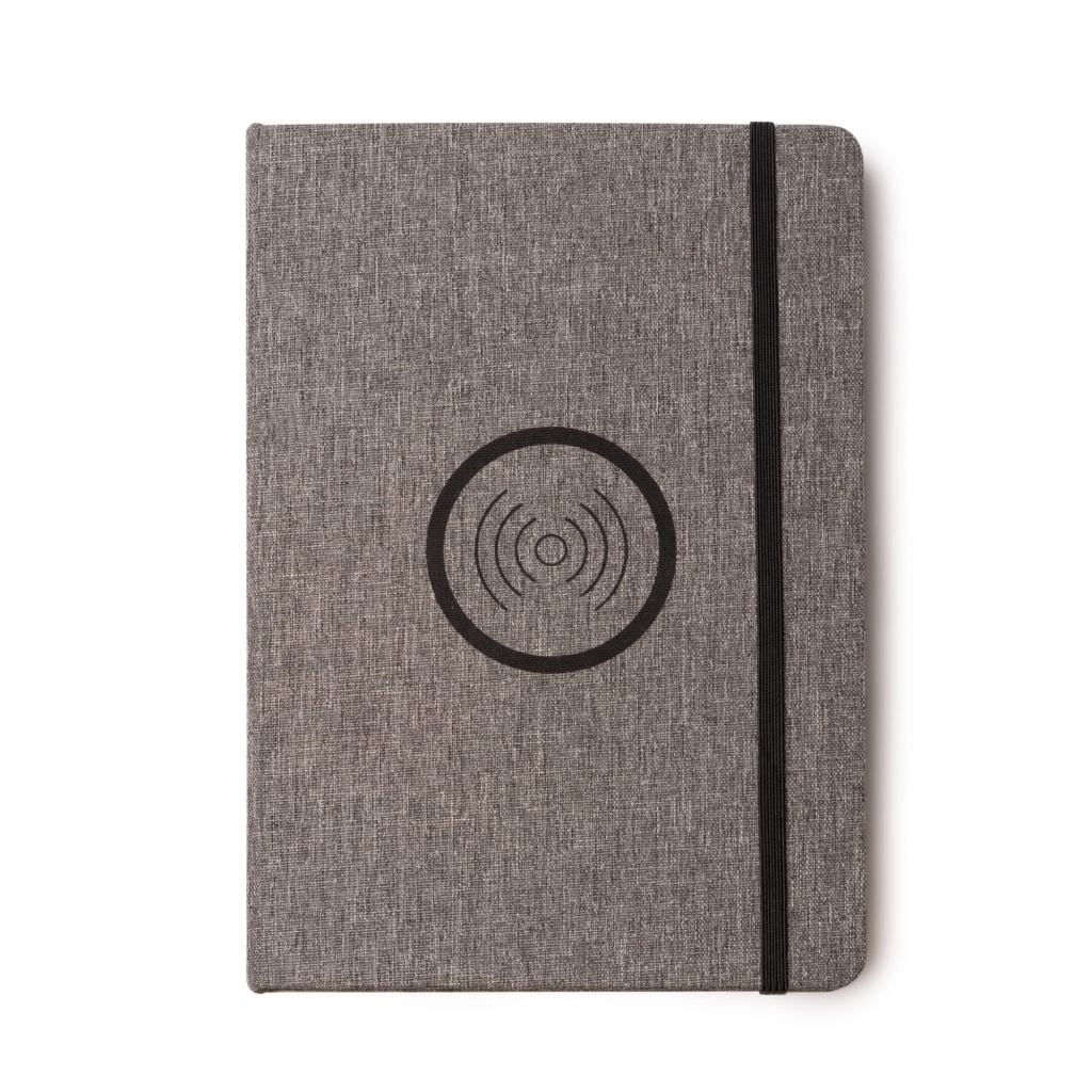 Notatnik w formacie A5 wykonany z tkaniny RPET, wyposażony w bezprzewodową ładowarkę o mocy 15 W. Posiada port USB typu C do zasilania oraz elastyczne zapięcie.