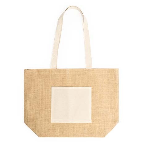 Torba wykonana z laminowanej juty, wyposażona w przednią kieszeń oraz długie uchwyty z naturalnej bawełny.