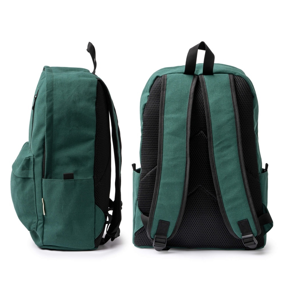 Plecak uszyty z bawełny pochodzącej z recyklingu o gramaturze 330 g/m². Posiada dużą komorę główną z wewnętrzną kieszenią na laptopa 15 cali, 2 kieszenie zewnętrzne zapinane na zamek błyskawiczny oraz 2 kieszenie boczne. Wyściełane uchwyty i plecy.