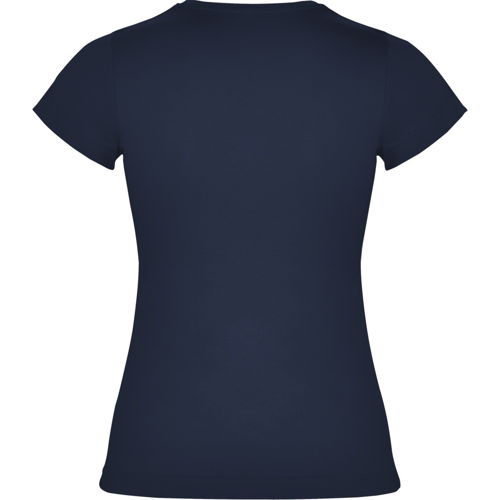 Dopasowana koszulka damska. Zaokrąglony, dwuwarstwowy ściągacz przy szyi, typowo damski fason. Wzmocnione, kryte szwy przy kołnierzyku i na ramionach, szwy boczne.