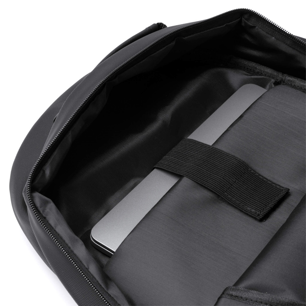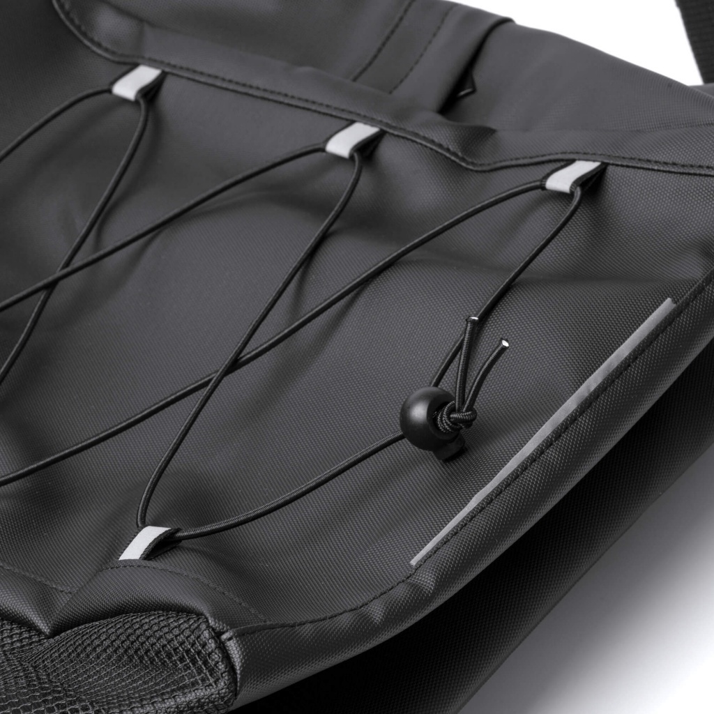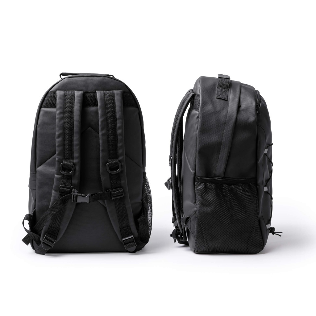Plecak z wytrzymałej skóry PU z odblaskowymi detalami. Posiada przestronną główną komorę z wewnętrzną kieszenią na laptopa do 17 cali, przednią część z elastycznymi ściągaczami oraz boczną kieszeń. Regulowane uchwyty, wyściełane plecy i rączki. Pojemność: 20l