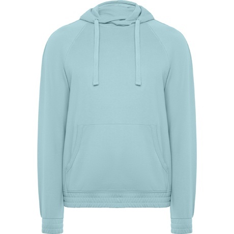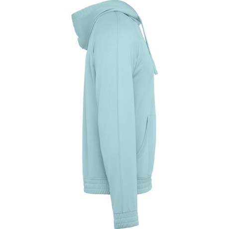 Uniwersalna bluza z kapturem w kroju unisex. Model typu kangurka z praktyczną kieszenią na brzuchu. Gładkie sznurki wyposażone w haftowane oczka. Brzegi bluzy przy pasie i rękawach wykonane z tego samego materiału. Na rękawach widoczny wypukły szew.
