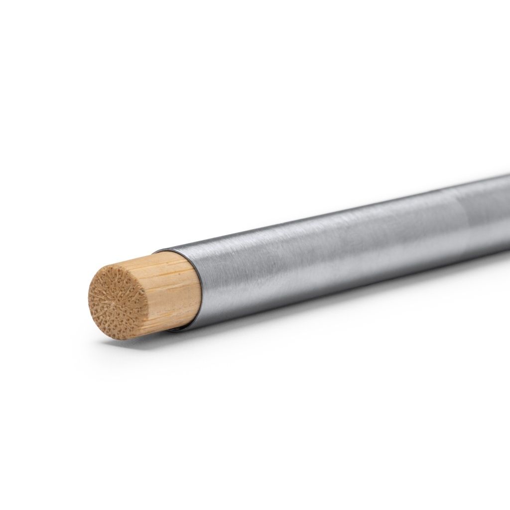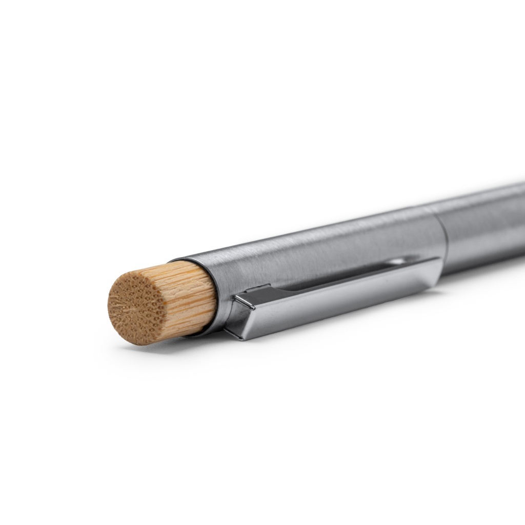 Długopis z korpusem ze stali nierdzewnej pochodzącej z recyklingu oraz przyciskiem z bambusa.