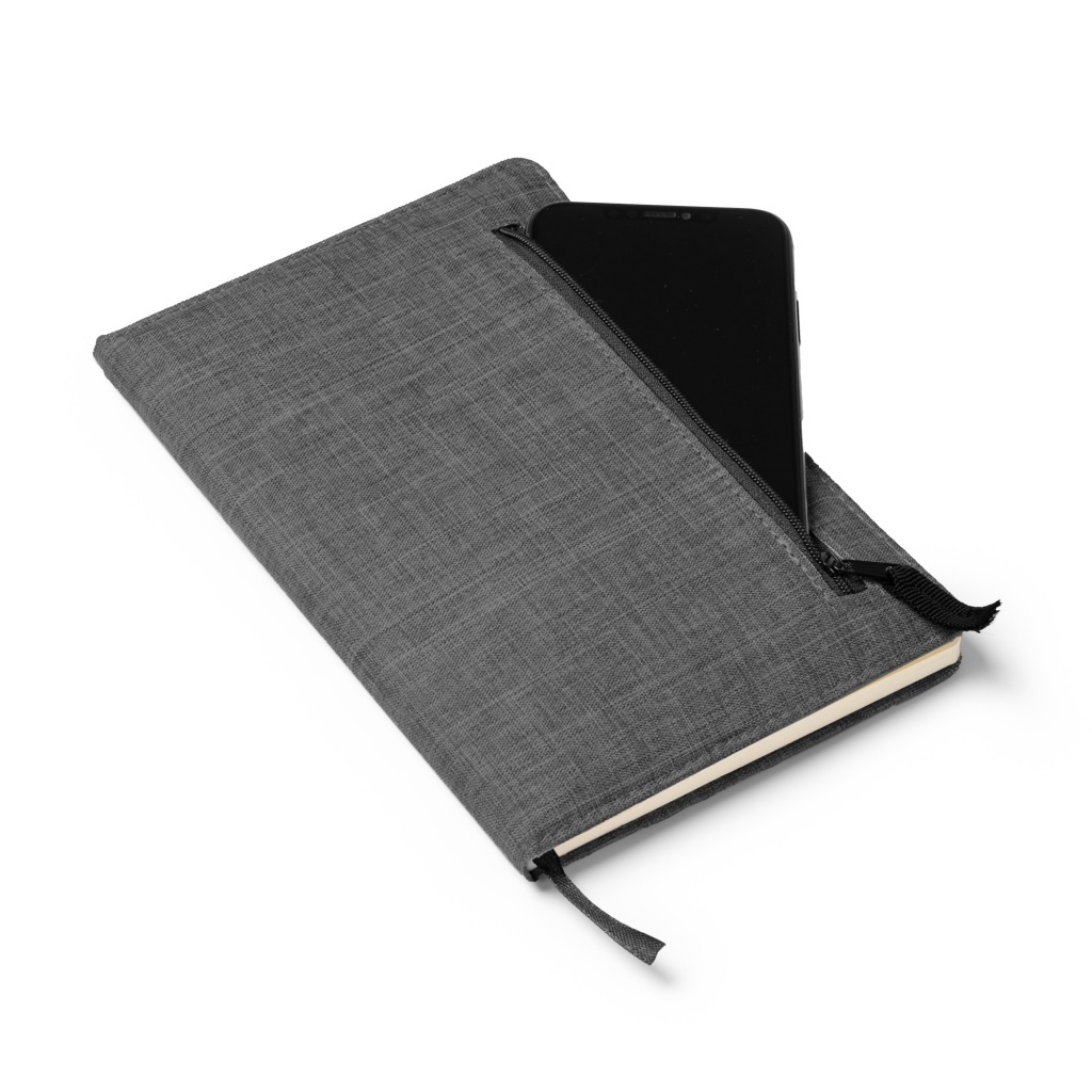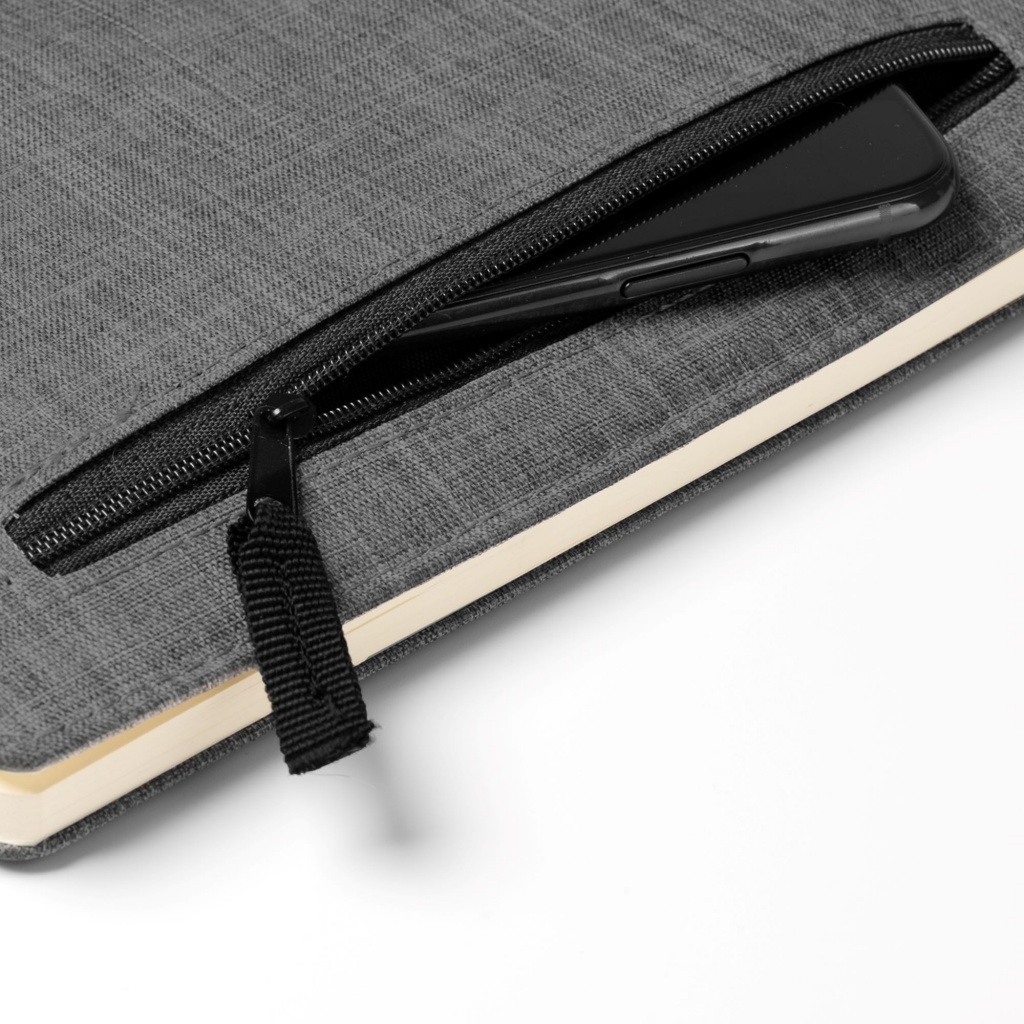 Zeszyt A5, okładka wykonana z tkaniny RPET. Zewnętrzna kieszeń zapinana na zamek błyskawiczny. W zestawie zakładka. 80 kartek w linie.