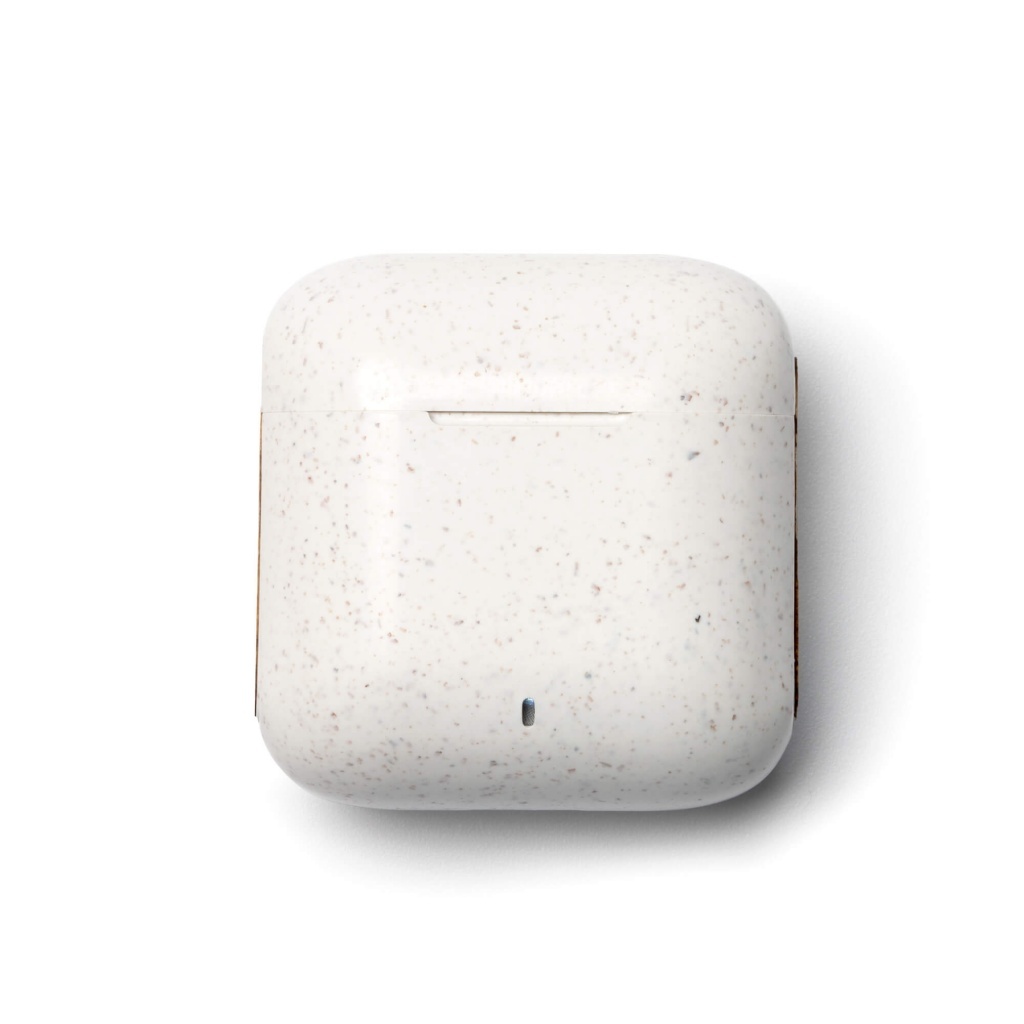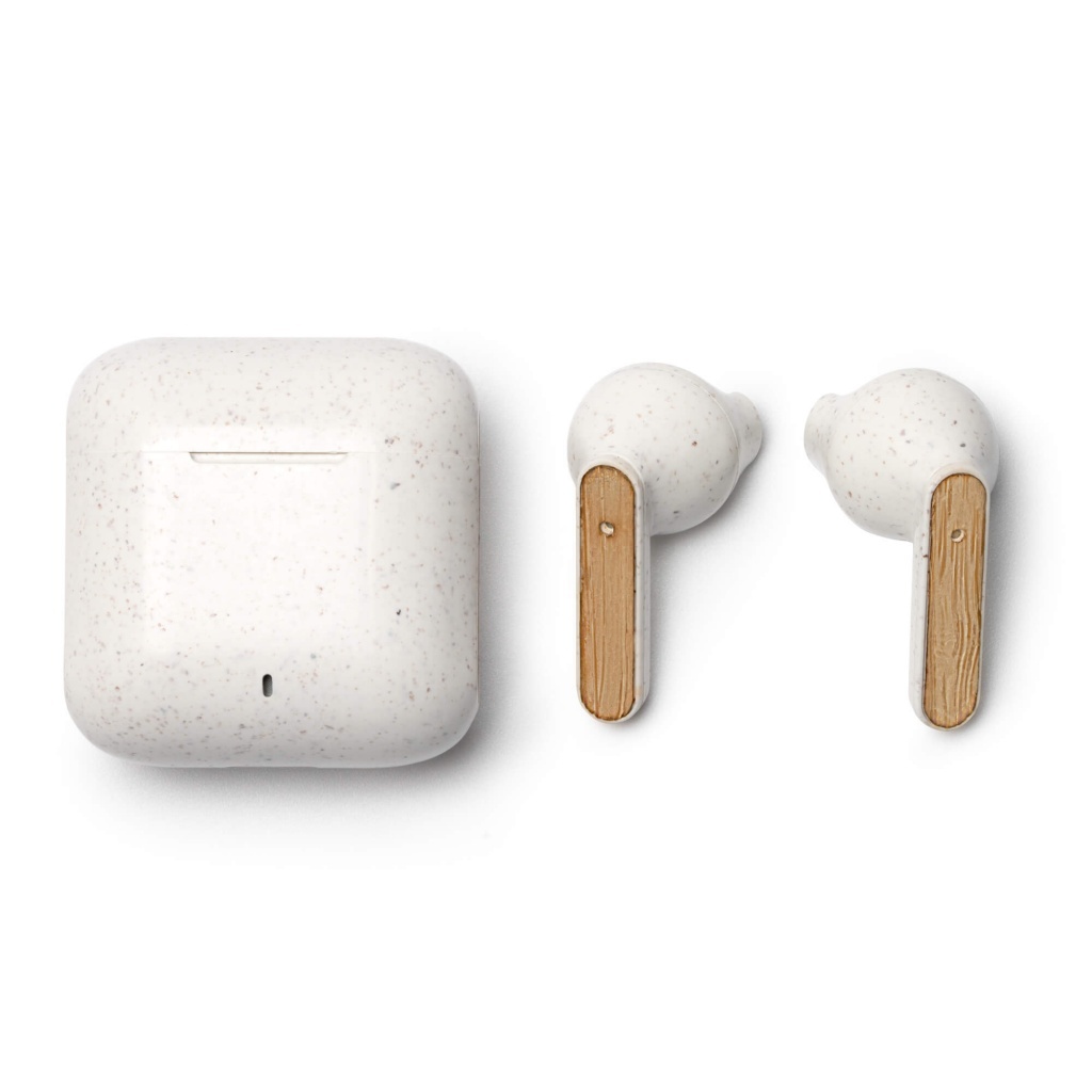 Bezprzewodowe słuchawki douszne wykonane z włókna pszenicznego i bambusa, wyposażone w etui ładujące.