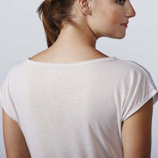 T-shirt z krótkim rękawem i szerokim dekoltem. Charakterystyczny detal: wiązanie na boku.