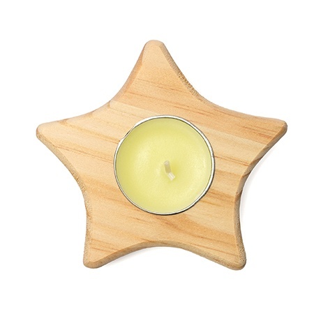 Świeca na drewnianej podstawce z motywem świątecznym (gwiazdka i choinka).