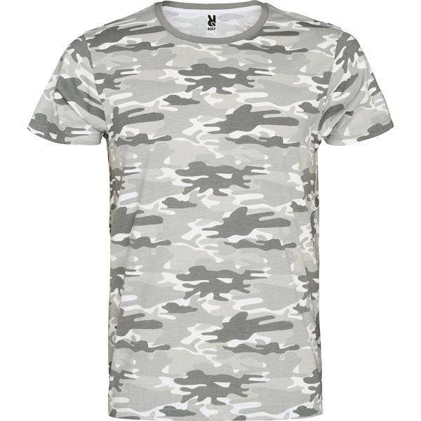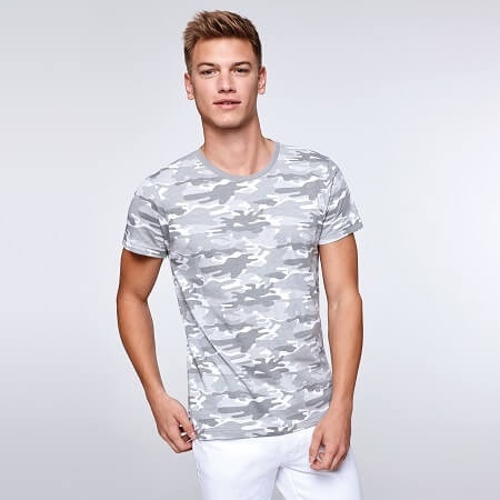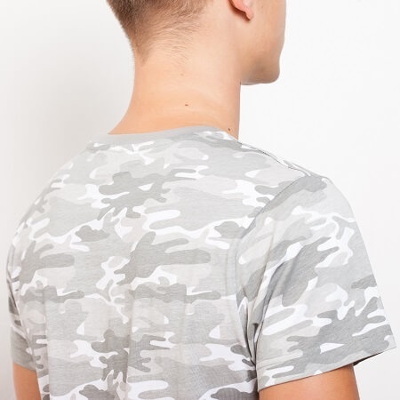 T-shirt z krótkim rękawem w stylu moro. Zaokrąglony kołnierzyk. Czterowarstwowy ściągacz, wzmocnione kryte szwy na karku i ramionach. Szwy boczne.