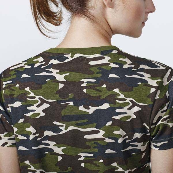 T-shirt z krótkim rękawem w stylu moro. Zaokrąglony kołnierzyk. Czterowarstwowy ściągacz, wzmocnione kryte szwy na karku i ramionach. Szwy boczne.