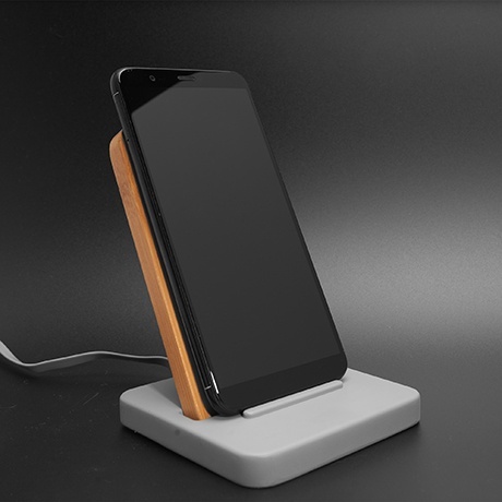 Bezprzewodowa ładowarka z podstawą z cementu wapiennego i prostokątną nakładką z naturalnego bambusa. Umieść na niej swój smartfon i pozwól mu się naładować. Kompatybilny z modelami telefonów z technologią bezprzewodową.