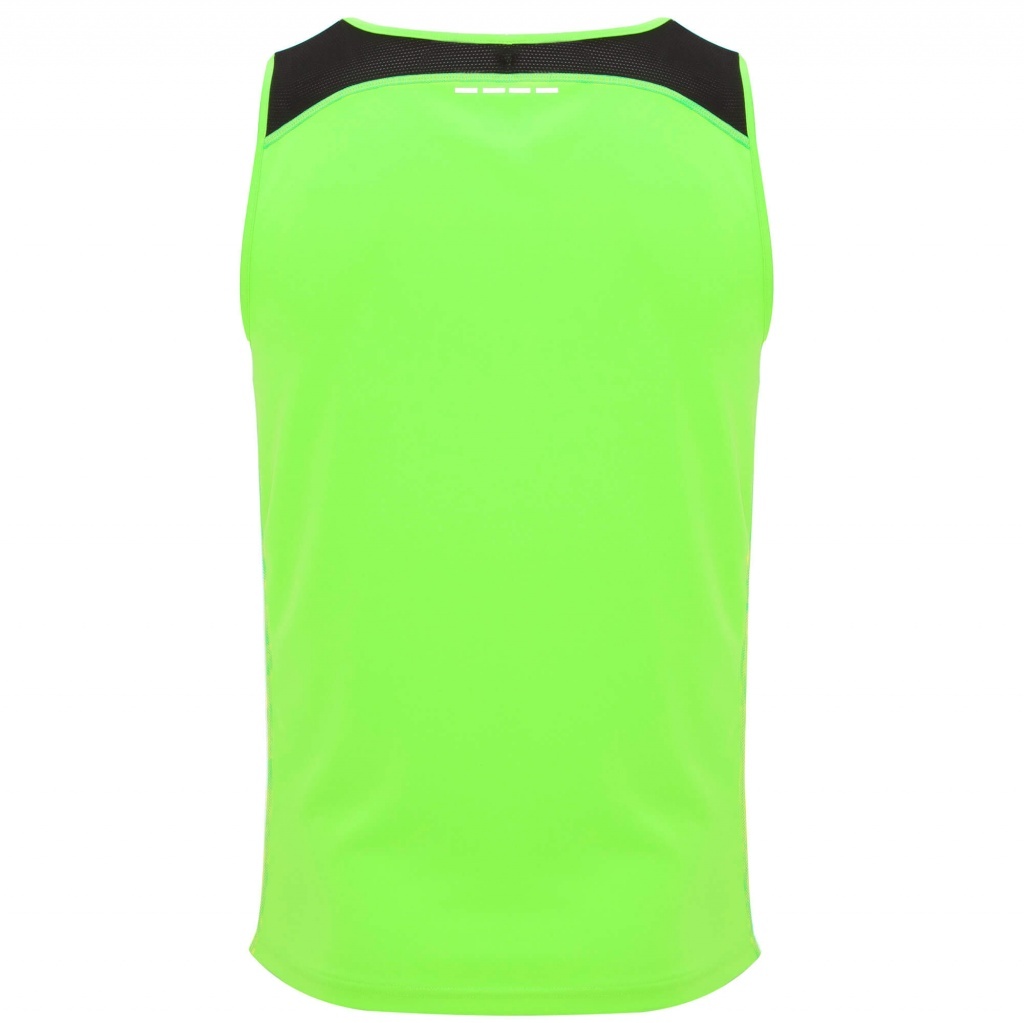 Koszulka techniczna na ramiączka wzbogacona o elementy odblaskowe. Posiada okrągły kołnierzyk oraz wzmocnione, kryte szwy na karku. Trójkolorowy model wykonany z dwóch materiałów poliestrowych: główna tkanina interlock oraz boczne i górne panele z mikroperforowanej tkaniny. Model szybkoschnący i łatwy w pielęgnacji.