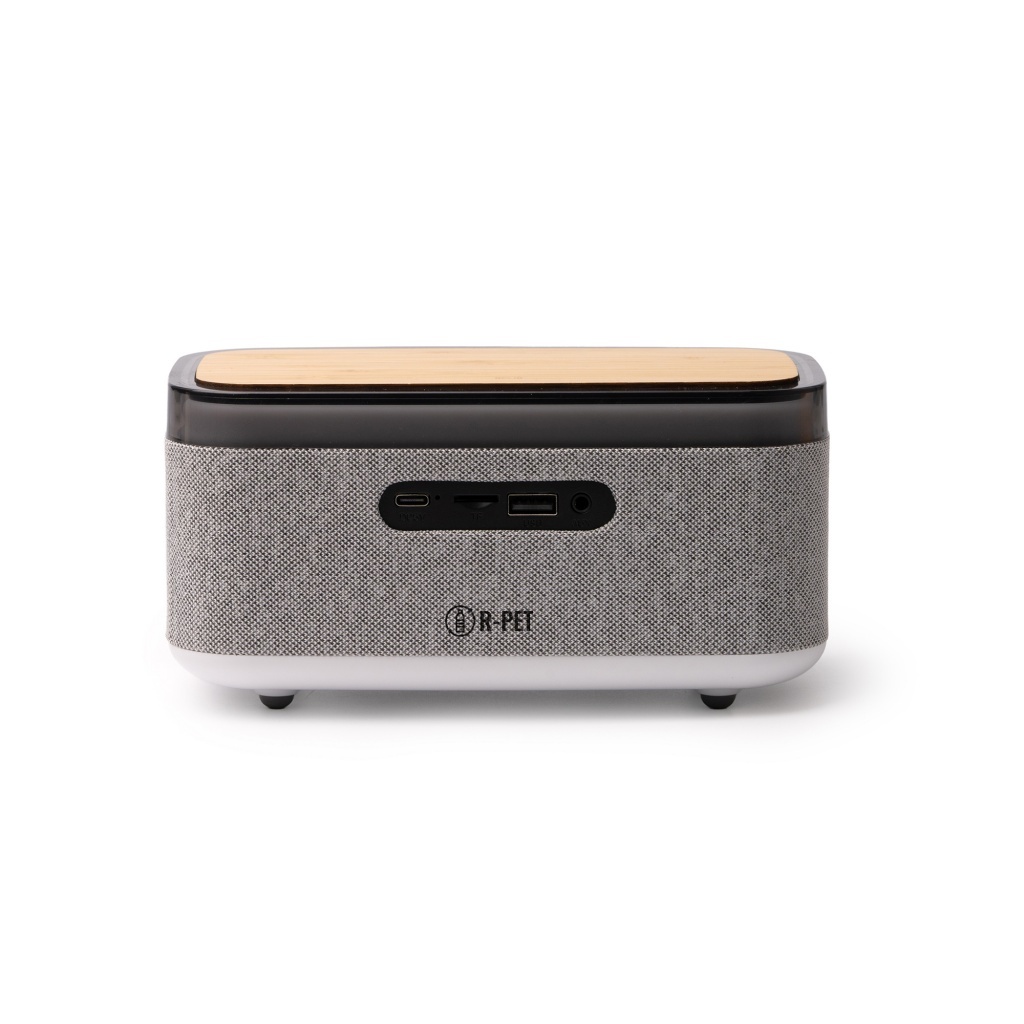 Bezprzewodowy głośnik wykonany z bambusa i tkaniny RPET z recyklingu, łączący styl i ekologię. Urządzenie pełni funkcję głośnika, budzika, lampy i zegara — wszystkie informacje wyświetlane są z przodu. Obręcz głośnika oferuje różne tryby oświetlenia, a wbudowana bezprzewodowa ładowarka 10W umożliwia szybkie ładowanie smartfona. Dostępne tryby odtwarzania: Bluetooth, relaksacyjne dźwięki i radio FM. Dodatkowo wyposażony jest w porty USB-C, USB, wejście AUX oraz slot na kartę pamięci.