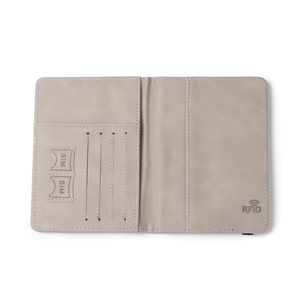 Etui na paszport z ekologiczną skórą PU, zamykane elastycznym paskiem. Posiada 3 kieszenie wewnętrzne na paszport i dokumenty, 4 kieszenie na karty oraz 2 kieszenie na karty SIM.