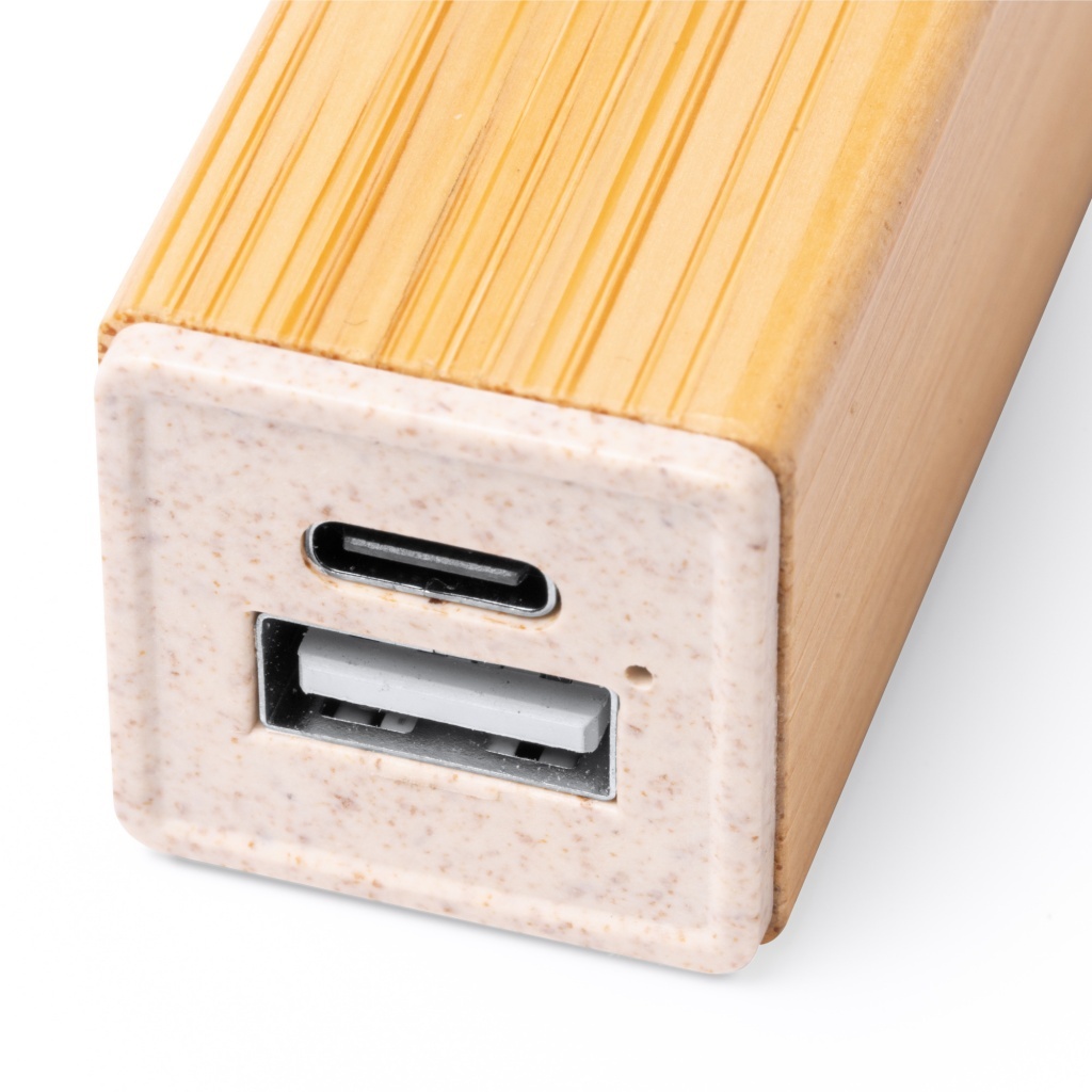 Powerbank o obudowie z włókna pszennego i bambusa. Pojemność: 2200 mAh. Wyposażony we wskaźnik ładowania LED oraz wejście i wyjście USB typu C. Produkt dostarczany jest w eleganckim pudełku.