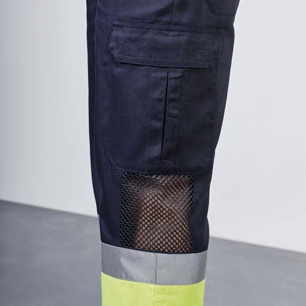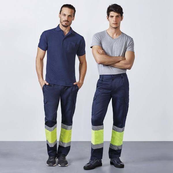 4. Dwukolorowe spodnie wykończone odblaskowymi pasami.