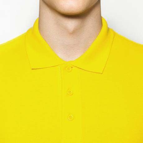Koszulka polo z krótkim rękawem. Zapięcie na trzy guziki. Prążkowany kołnierz. Wzmocnione, kryte szwy w kołnierzu i na ramionach.