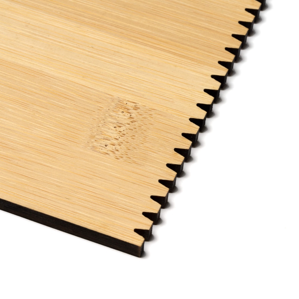 Skrobak do lodu z bambusa, posiadający jedną ząbkowaną i jedną gładką krawędź, przeznaczony do skutecznego usuwania lodu z szyb.