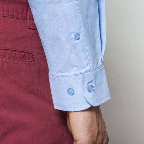 Męska koszula z kieszonką po lewej stronie piersi. Zapięcie na przedzie z ukrytymi guziczkami. Kołnierzyk zapinany na guziczki. Mankiety z dwoma guzikami.