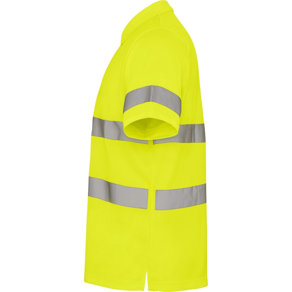 Techniczna, dobrze widoczna koszulka polo z krótkimi rękawami, zaprojektowana z kołnierzem prążkowanym 1x1, zapięciem na 3 guziki oraz dwoma poziomymi paskami o wysokiej widoczności na piersi i rękawach. Materiał odporny na zaciągnięcia zapewnia trwałość podczas intensywnego użytkowania.