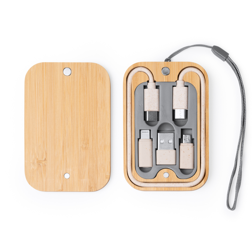 Zestaw kabli do ładowania umieszczony w etui z bambusa z magnetyczną pokrywą. Zestaw zawiera złącza micro USB, USB typu C oraz Lightning. W komplecie znajduje się praktyczny pasek do przenoszenia. Produkt zapakowany w opakowanie zaprojektowane z myślą o ochronie środowiska.