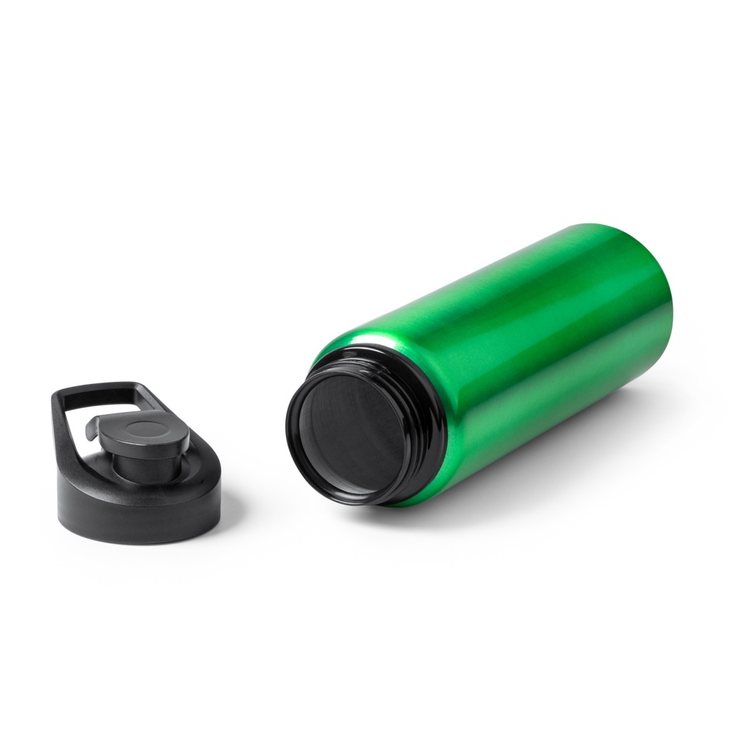 Raiden - Butelka z recyklingowanego aluminium z metalicznym wykończeniem. Wyposażona w bezpieczną zakrętkę i praktyczny uchwyt do przenoszenia.