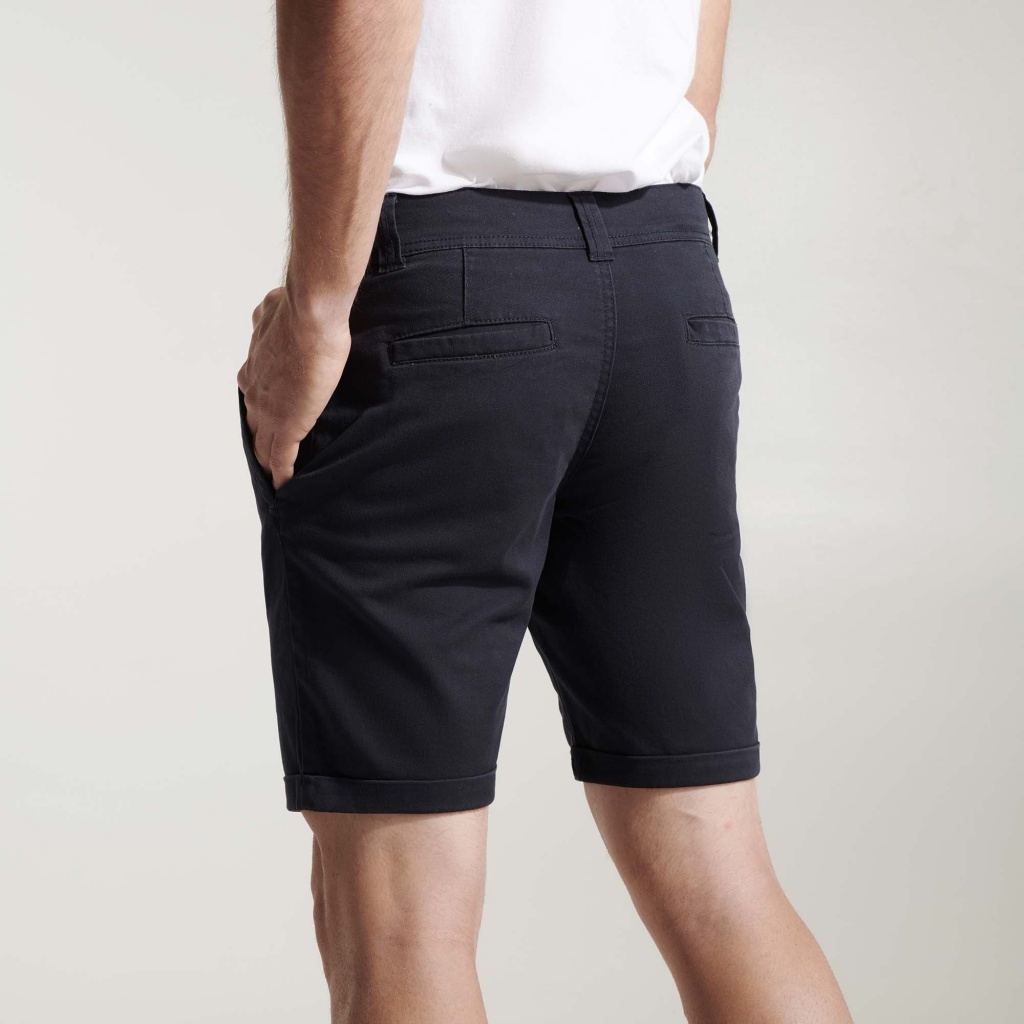 Szorty z podwiniętymi nogawkami. Boczne i tylne kieszenie wykończone lamówką. Materiał o zwiększonej odporności. Komfortowe szorty zarówno do pracy, jak i rekreacji.