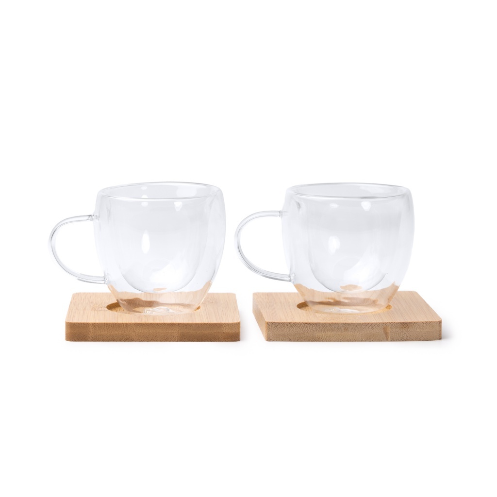 Zestaw do kawy zawierający 2 szklane kubki z podwójnymi ściankami oraz po jednej kwadratowej podstawce z bambusa dla każdego kubka. Podwójne ścianki zapewniają dobrą izolację termiczną i wygodę użytkowania.