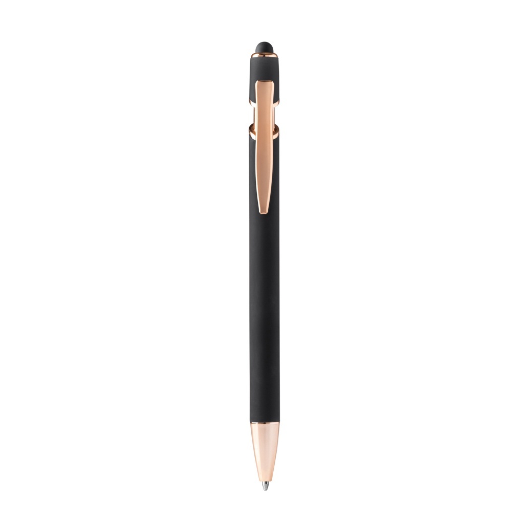 Metalowy długopis o miękkiej w dotyku powierzchni z detalami w kolorze różowego złota. Wkład Jumbo z niebieskim atramentem. Doskonały do druku laserowego.