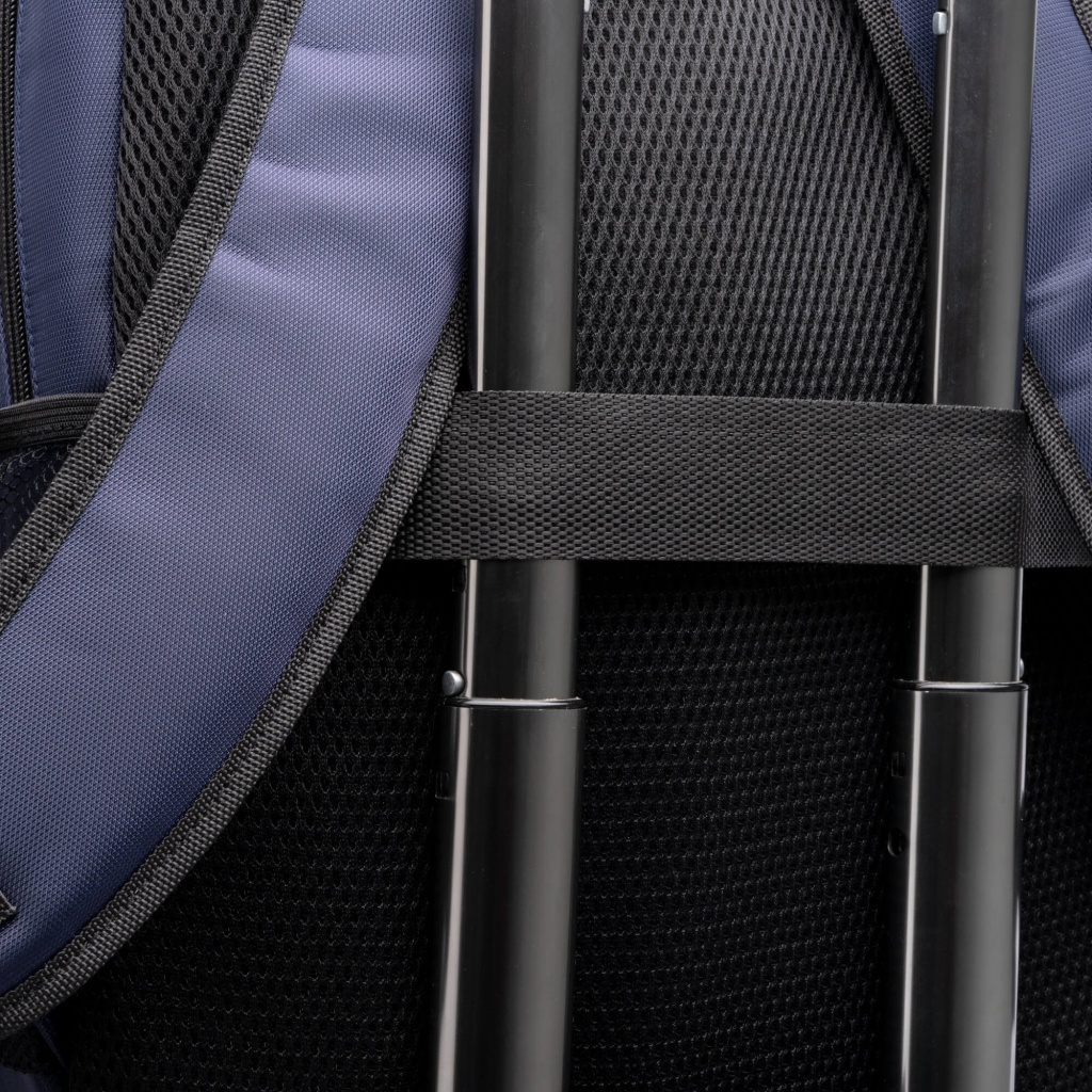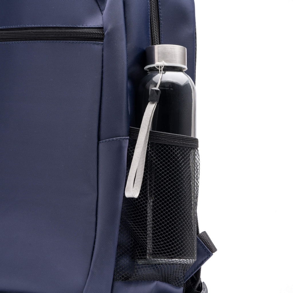 Plecak Executive wykonany z nylonu z recyklingu. Posiada pojemną główną komorę oraz wyściełaną kieszeń na laptopa o przekątnej 15 cali. Wyposażony w jedną kieszeń zewnętrzną i dwie boczne, wyściełane plecy i szelki oraz pasek do mocowania.