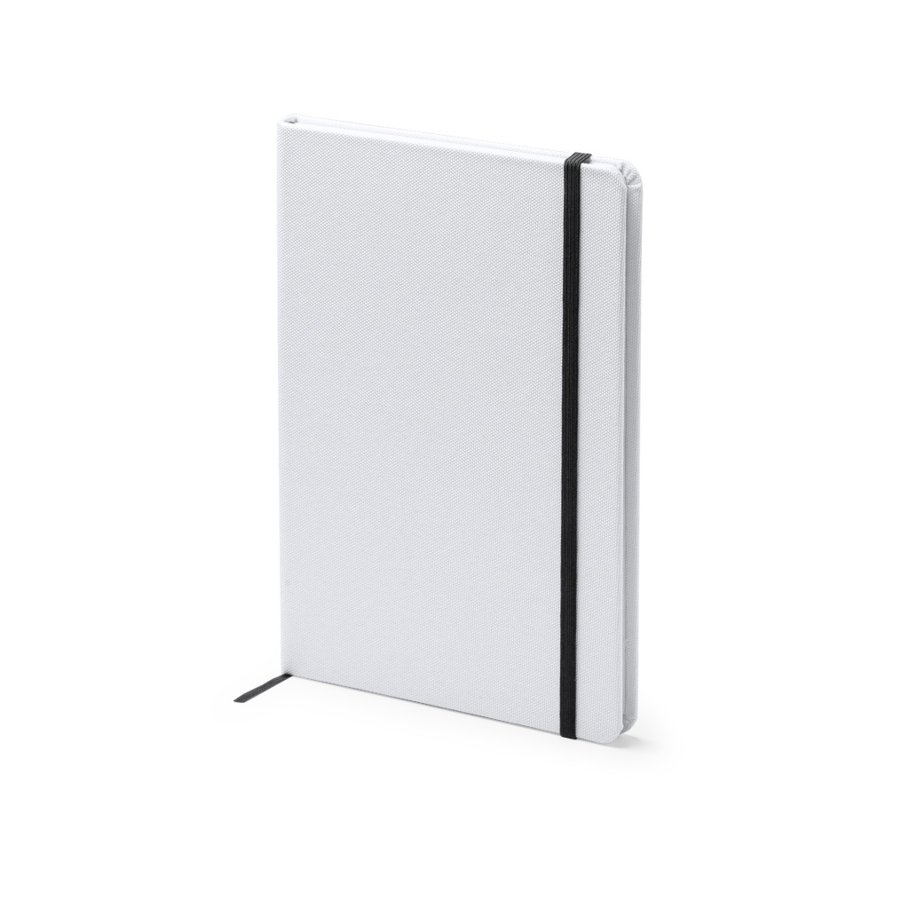 Notatnik w formacie A5 z twardą okładką, przystosowany do sublimacji. Posiada znacznik stron oraz dopasowaną elastyczną opaskę zamykającą. Zawiera 100 arkuszy zwykłego papieru.