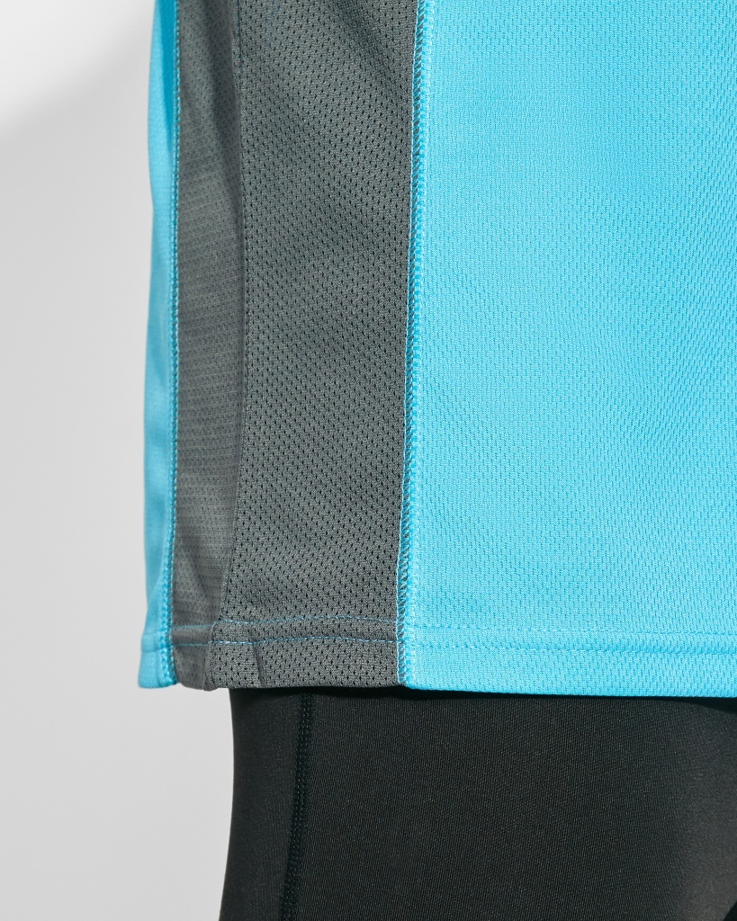 Dwukolorowa koszulka techniczna z bocznymi panelami i wstawkami pod pachami z mikroperforowanej tkaniny. Okrągły dekolt wykończony wzmocnionymi, krytymi szwami. Dopasowuje się do sylwetki, jest przewiewna, łatwa w praniu i szybkoschnąca.