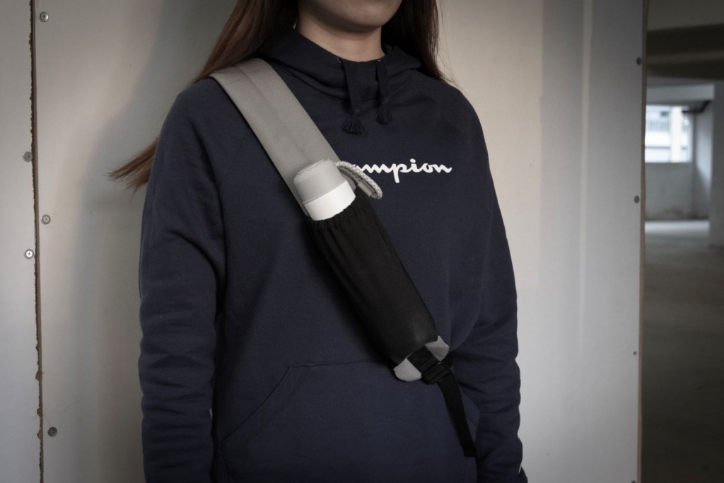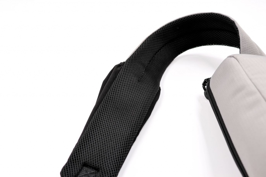 Konstrukcja wykonana jest w całości z butelek PET z recyklingu i ma ergonomiczną sylwetkę zawieszoną na oddychającym pasku z siatki oraz praktyczną kieszenią na telefon lub butelkę z wodą.