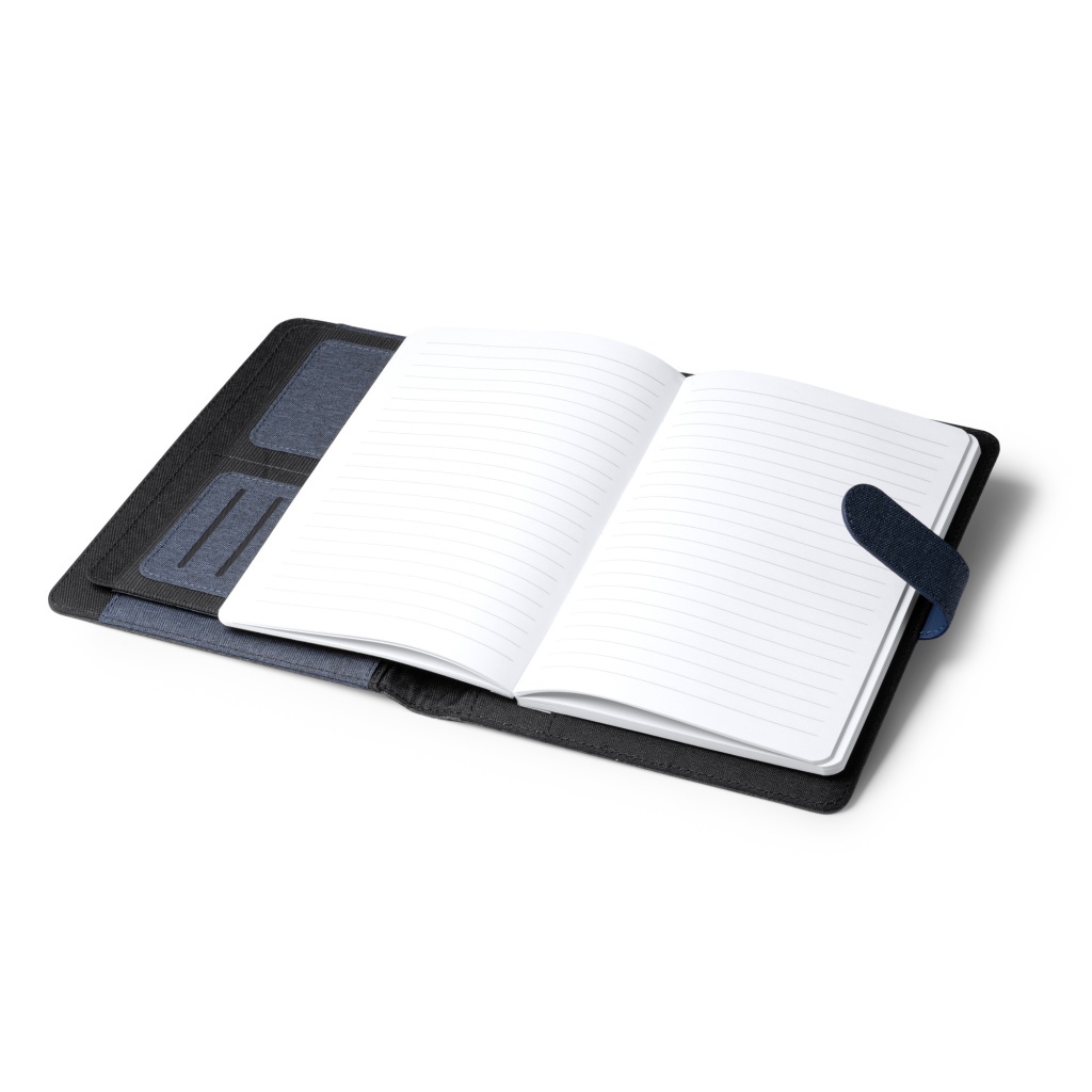 Wielofunkcyjna teczka z tkaniny RPET w formacie A5, wyposażona w magnetyczne zamknięcie. Zeszyt z wyrywanymi kartkami — 80 kartek w linię. Produkt posiada 3 główne komory wewnętrzne, 2 kieszenie na karty oraz uchwyt na długopis. Zapakowana w pudełku eco design.