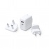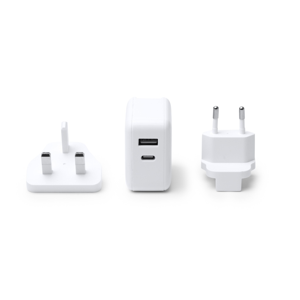 Uniwersalny adapter podróżny z wymiennymi wtykami, kompatybilny z instalacjami w Europie, Wielkiej Brytanii, Azji, USA i Australii. Wyposażony w port USB 3 A oraz USB-C.