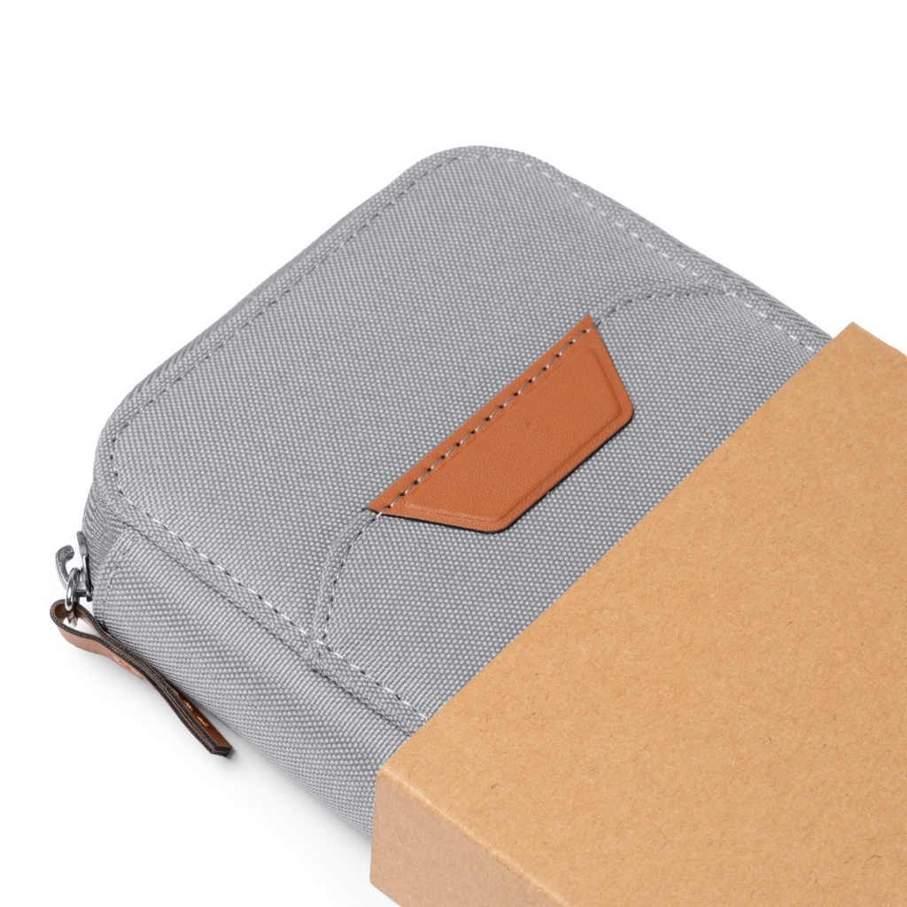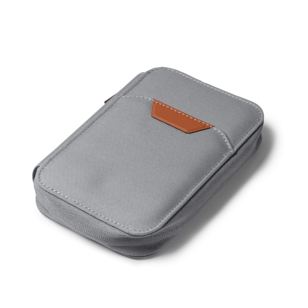 Portfel podróżny wykonany z tkaniny RPET 600D i skóry PU, zamykany na zamek błyskawiczny, z zewnętrzną kieszenią.